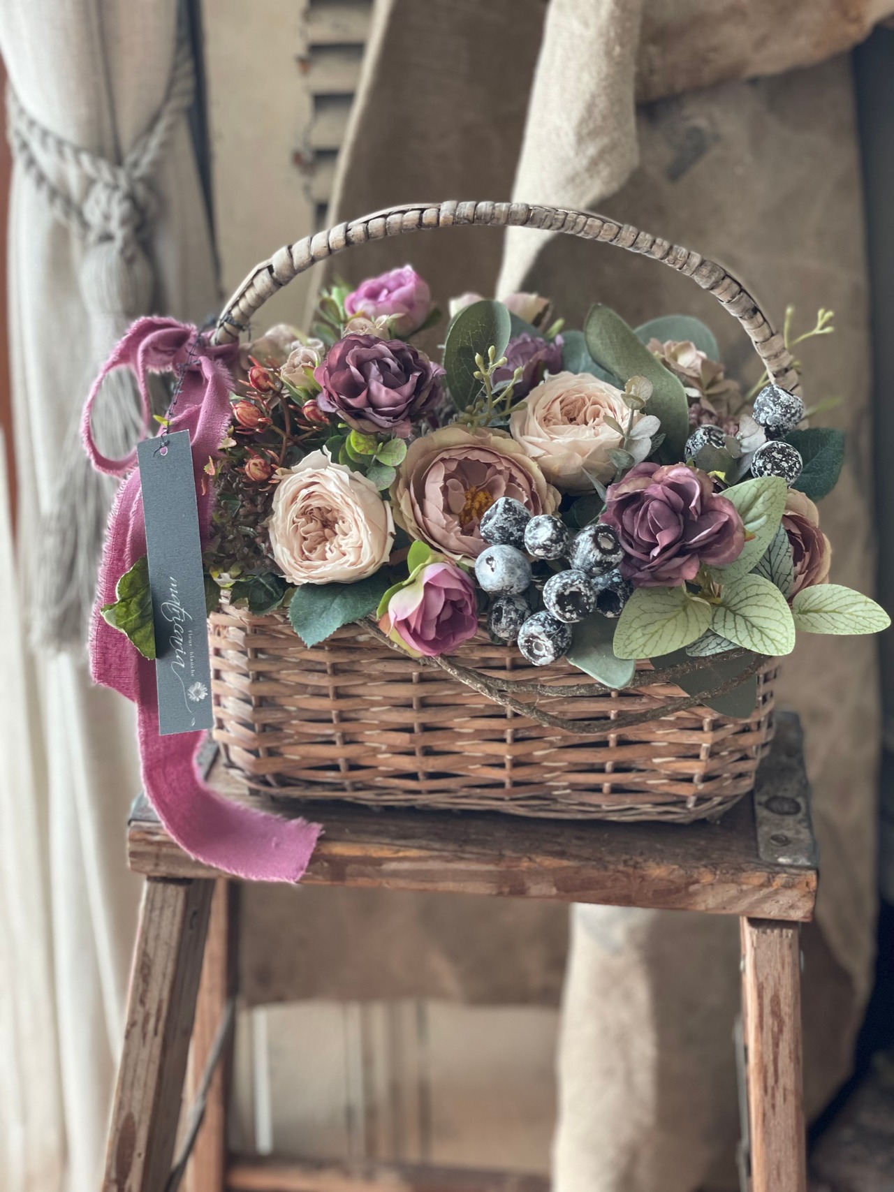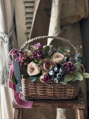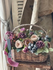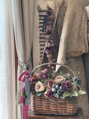 シャビーなパニエにモーヴカラーのローズを中心にアレンジしました。