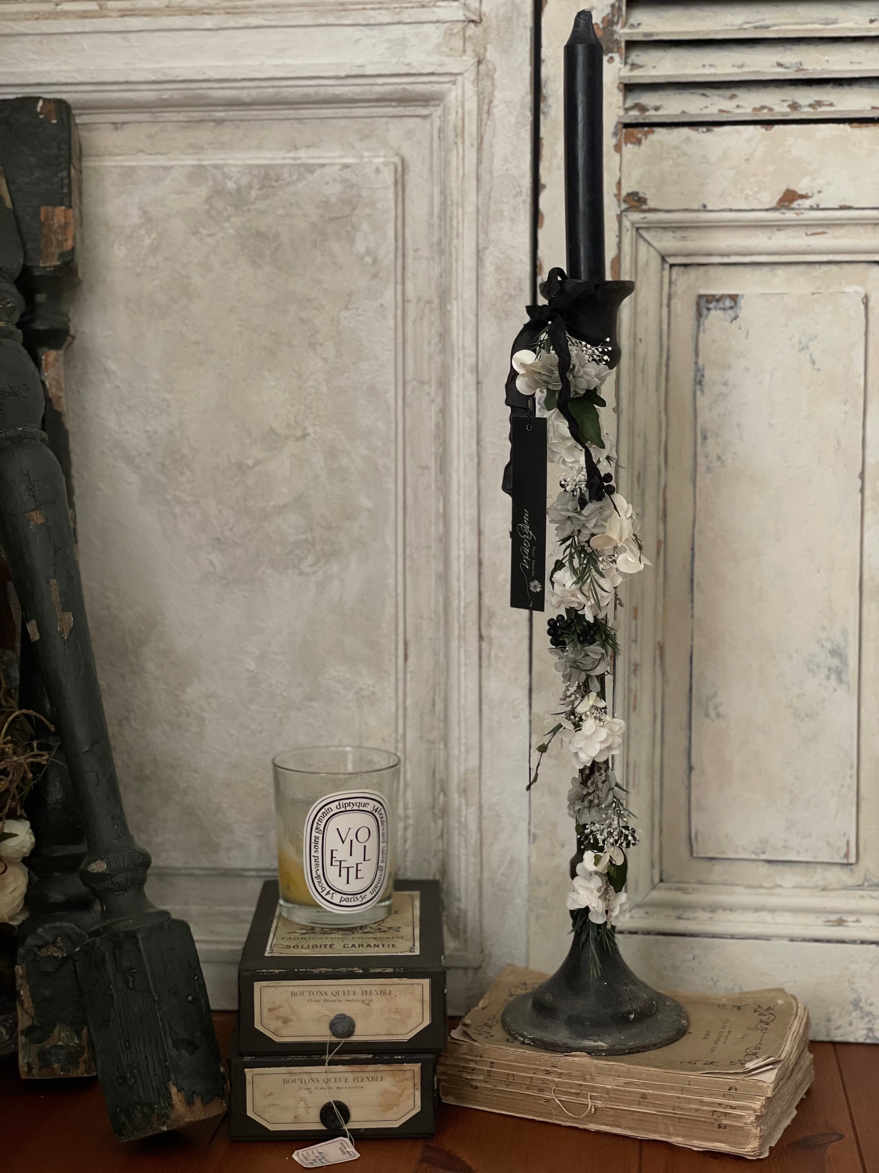 高さ40センチほどのシャビーなブラックキャンドルスタンドにガーランドを絡ませた