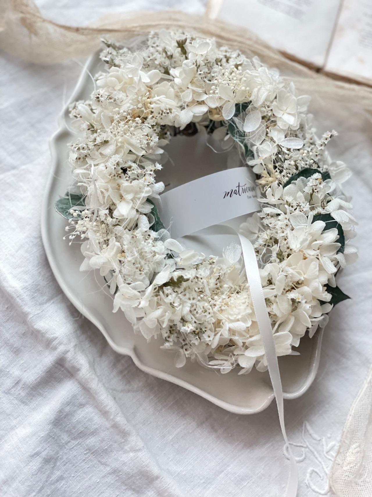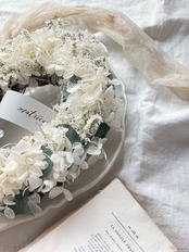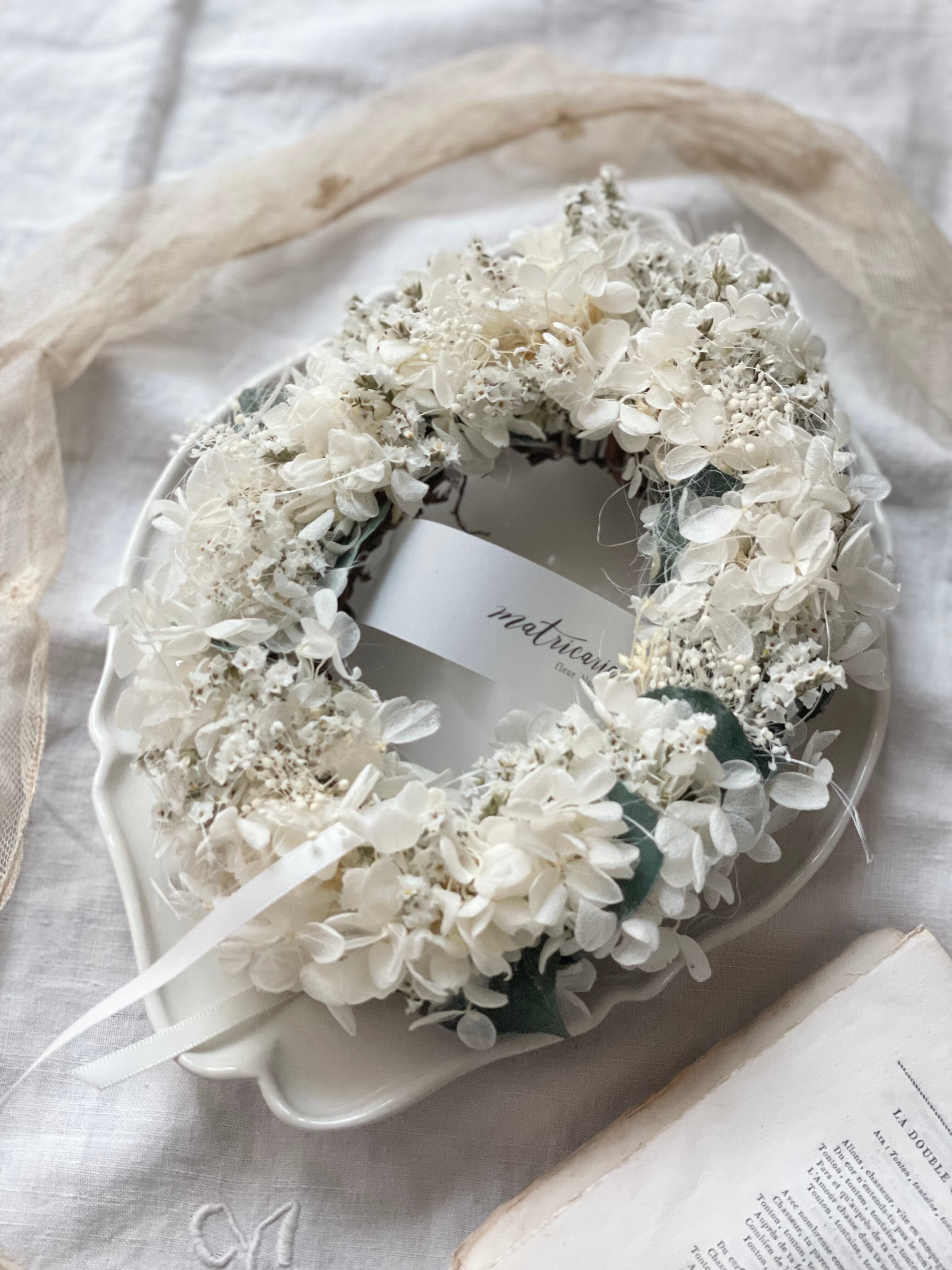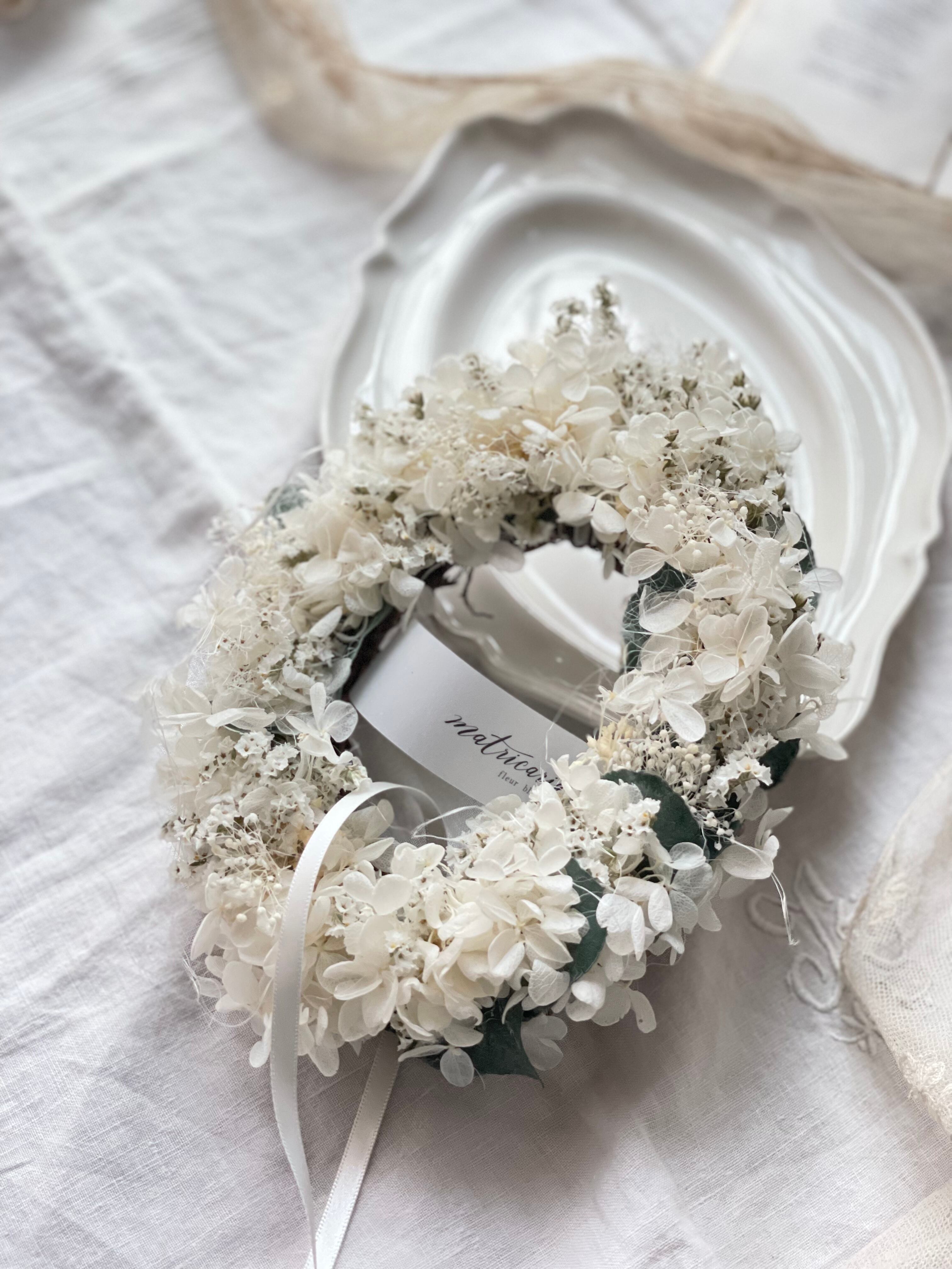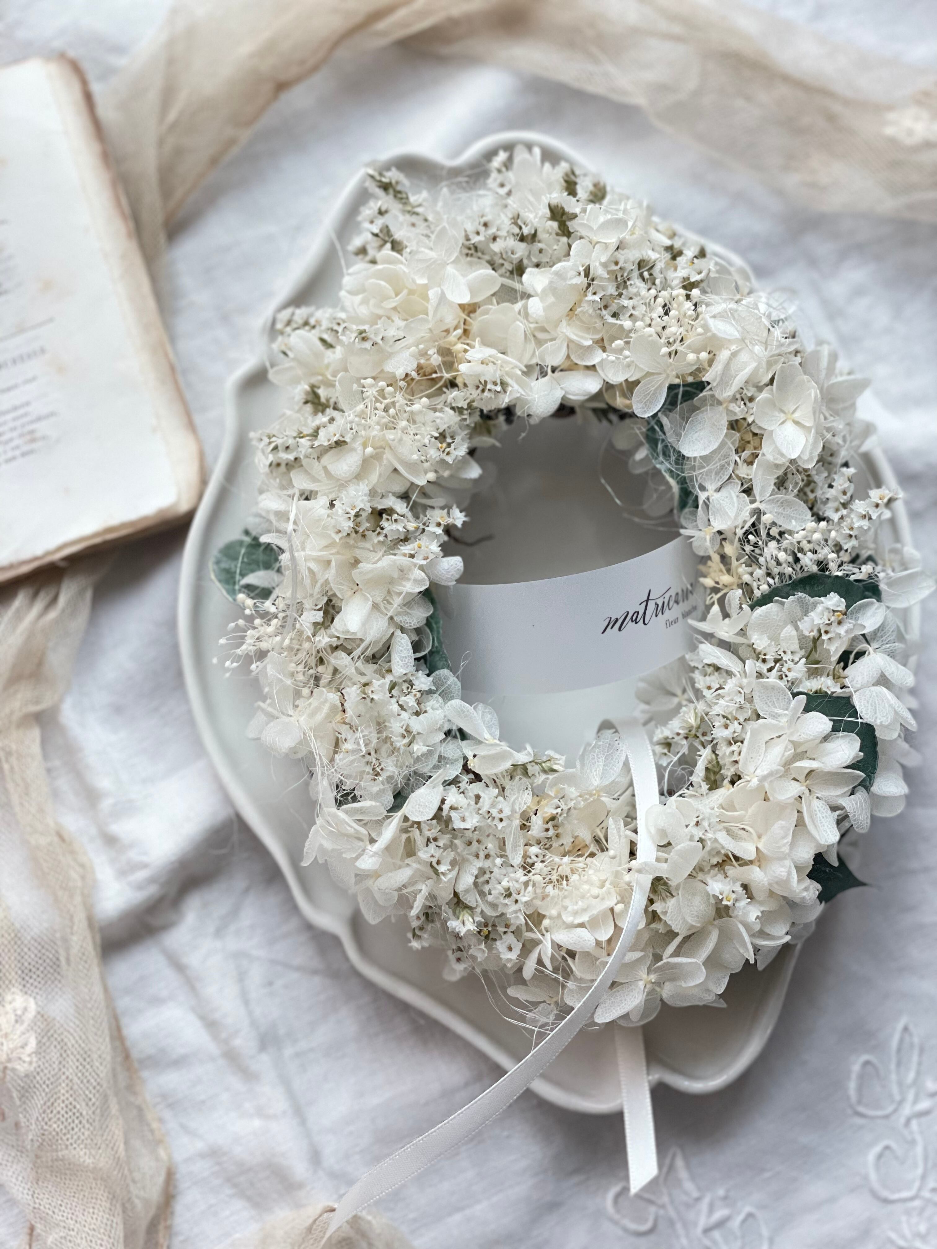 あじさいとスターチス&ユーカリの真白オーバルリース