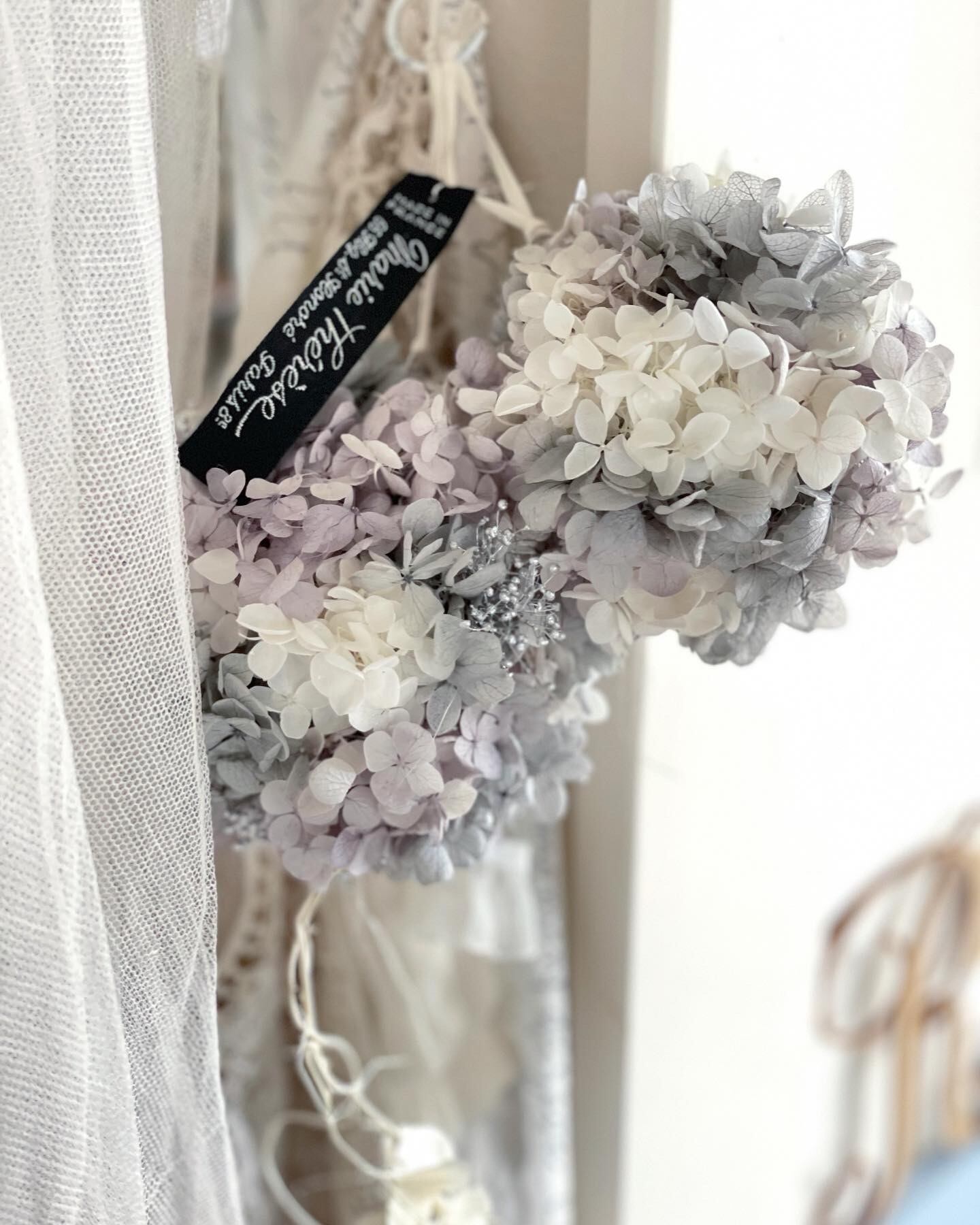 大の方はシルバーのかすみ草とミニヤマイモツルをアレンジ。