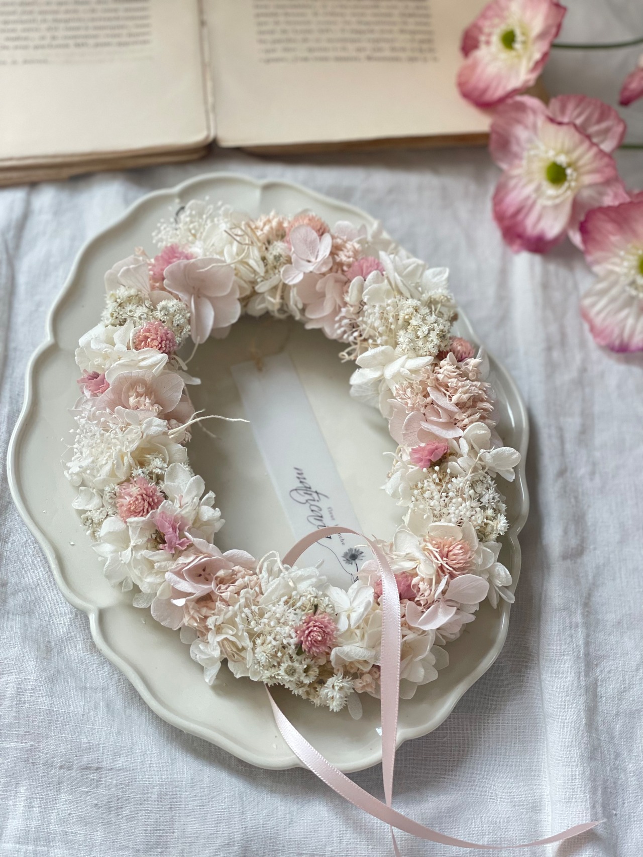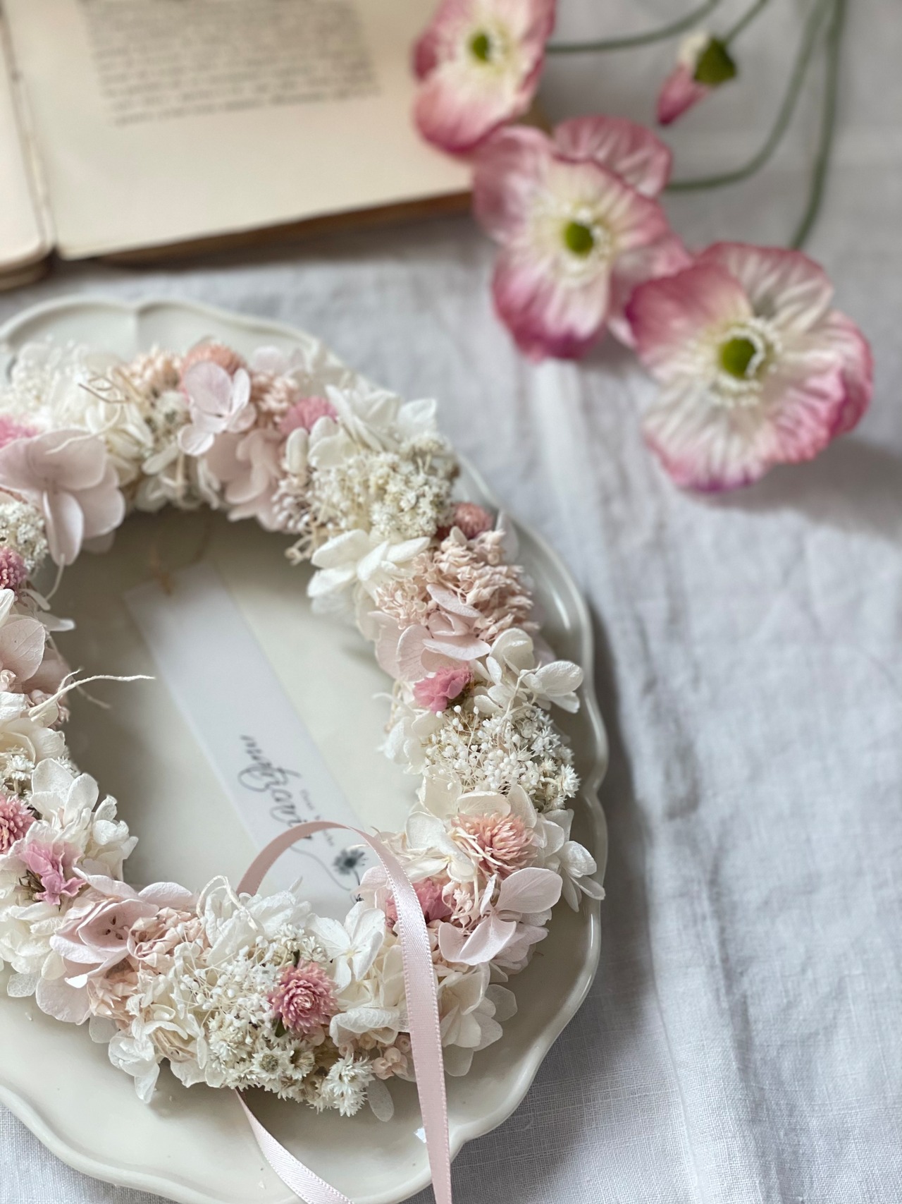 あじさいとハハコ草のオーバルリース〜さくら色〜