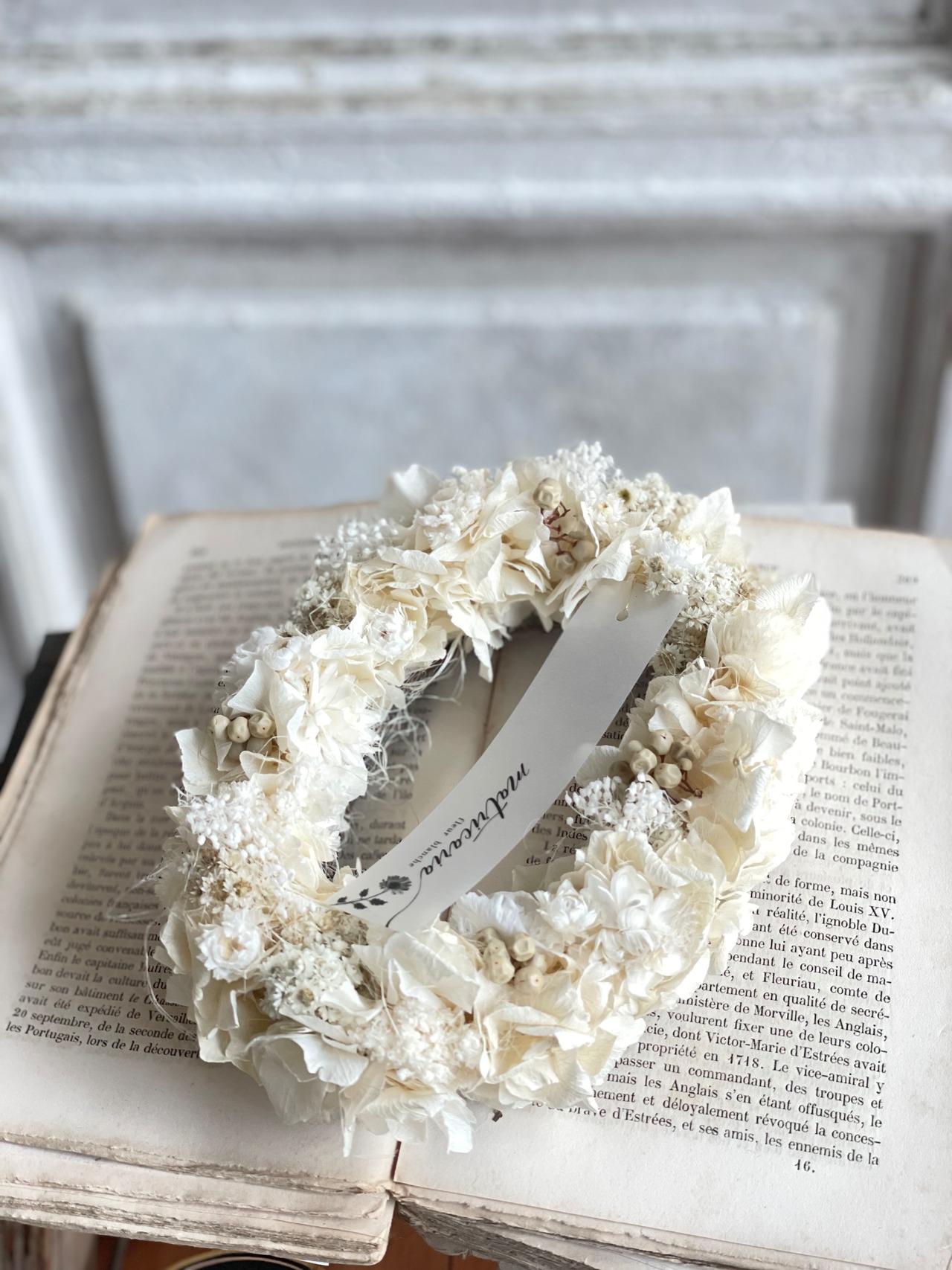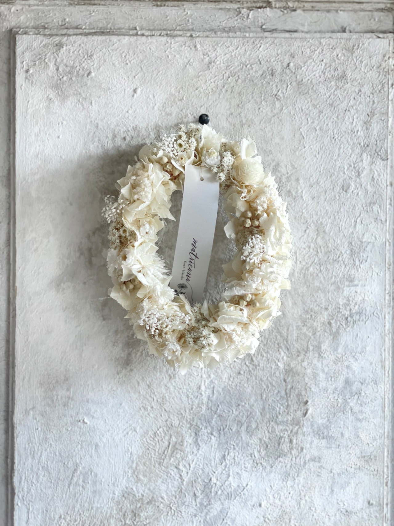 écruあじさいと小花のオーバルリース